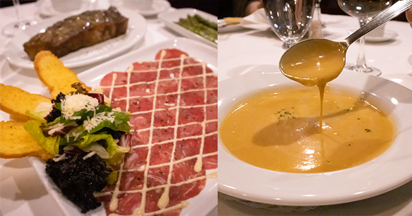 前菜三選一,頂級菲力牛肉薄片(圖左)附上香蒜麵包,將生牛肉放在麵包上一起享用,吃起來相當清爽開胃,龍蝦湯(圖右)第一口就驚艷,滿滿的龍蝦味就像一整隻龍蝦用喝的一樣,當下心想,龍蝦用喝的會不會太奢侈阿~~~