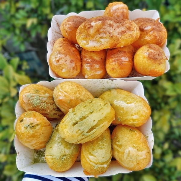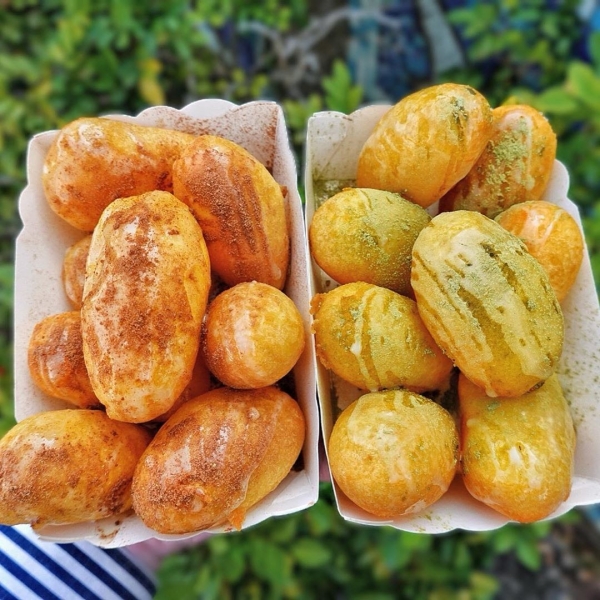 是用煉乳搭配上抹茶粉,地瓜球咬下去的同時,帶著酥酥脆脆的口感,隨後煉乳的香甜還有抹茶的苦香逐漸在口中擴散,超好吃!