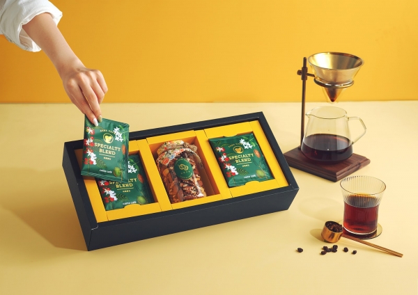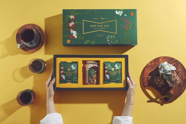 「團圓禮盒」內有cama咖啡品質鑑定師 (CQI Q grader),精心規劃烘焙的「林間寶石」濾掛咖啡,以日曬與水洗兩種處理法,搭配中度烘焙,帶出馥郁的核果香氣與巧克力香醇喉韻,甜潤回甘讓人再三回味。