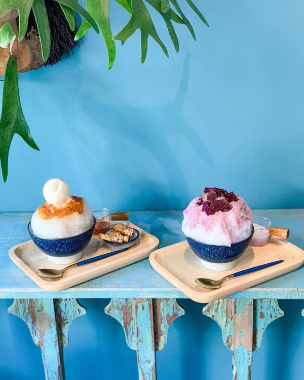 採日式簡約風布置、搭配暖色燈光、沖繩手染布以及綠色盆栽,營造舒適的用餐空間。碗內裝盛著高高的潔白刨冰淋上自製果醬相當療癒,窗外還能享受著正濱漁港的美景十分幸福!