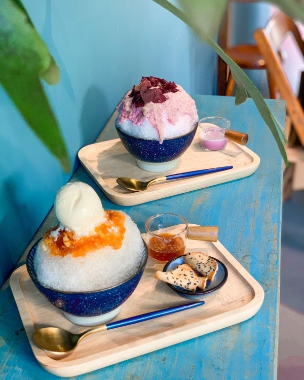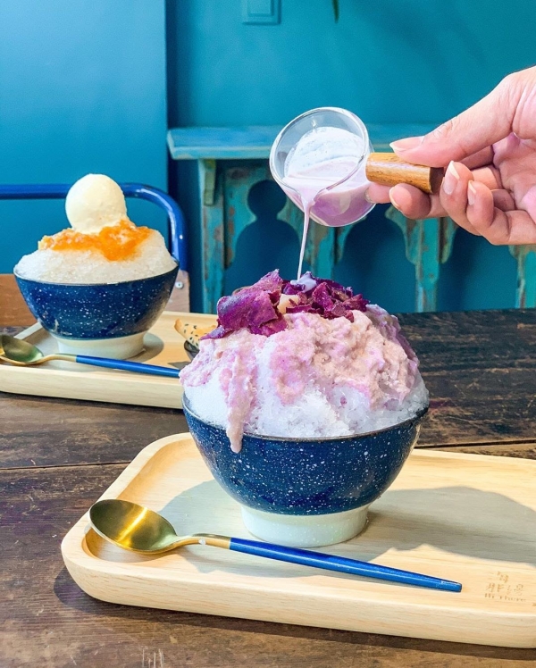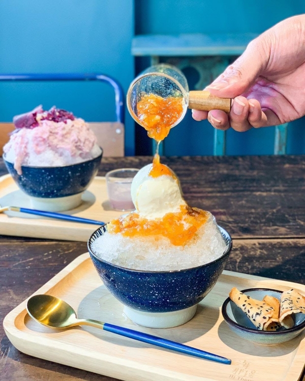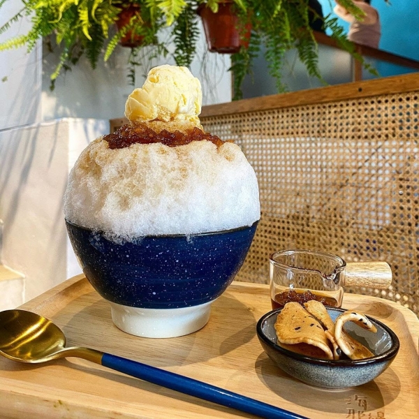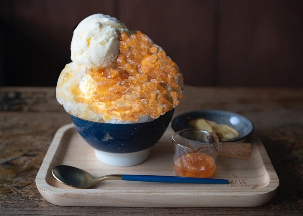 熬煮過的蘋果醬很香甜,冰的底層還有花凍,口感Q彈很像愛玉。有機蘋果搭配自製蘋果酒熬煮,酸甜滋味濃厚,加上焦糖,就如同陽光在海面一般,在綿冰上暈染。還有一球香草冰淇淋,就像是日出太陽!