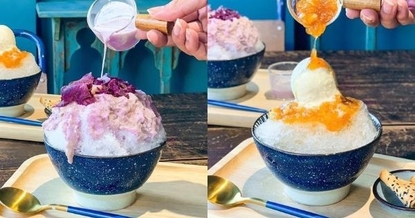 店家自熬的芋頭,配上紫芋奶霜還滿香濃的!滿滿的芋泥有如岩漿一般沿著頂端流下來,真的太邪惡餒!上頭還有放上紫地瓜脆片,裏頭還有古早味花豆和軟花生~這款有點懷舊復刻的風味!