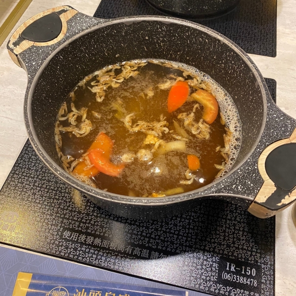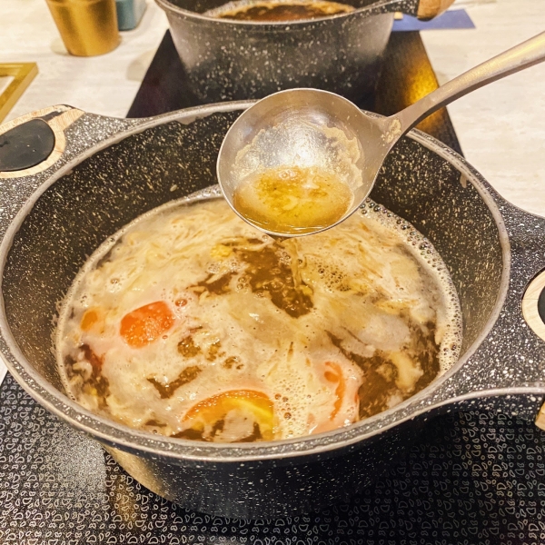 招牌的扁魚鍋湯底,使用秘製的老滷汁及油酥過的東港刺扁魚和赤尾青蝦熬煮,再加入鹹芥菜和蕃茄來提升湯的鮮甜度。清爽的扁魚湯頭,搭配沙茶醬一起做享用!