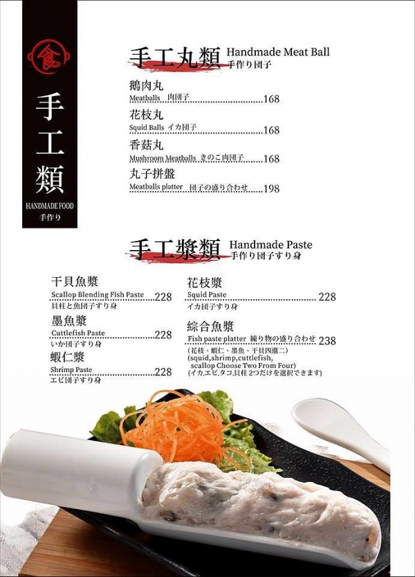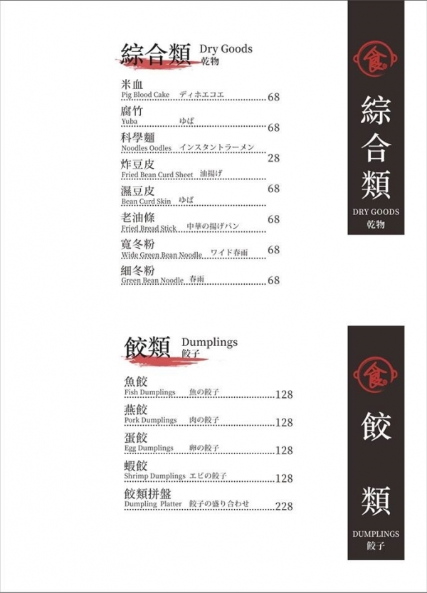 手工丸、餃類、綜合類、滷水和飲品酒水,建議多人一起來可以點的比較豐富。