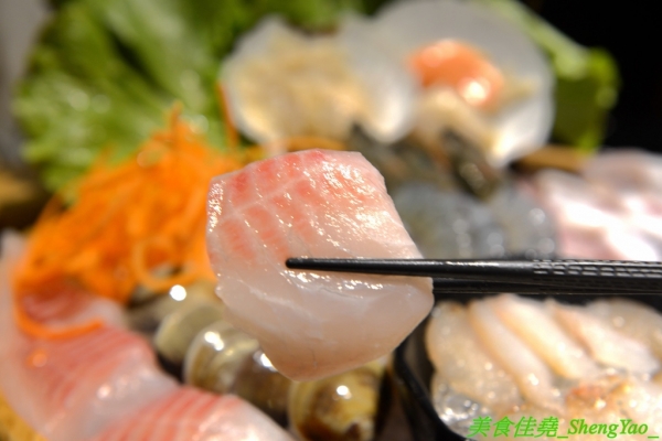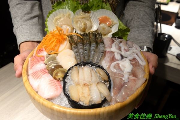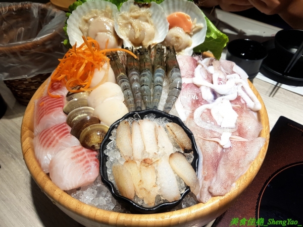 上面有扇貝、北海道干貝、草蝦、蛤蠣、鯛魚片、蟹管肉、中卷,