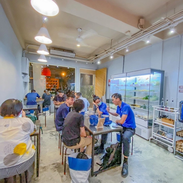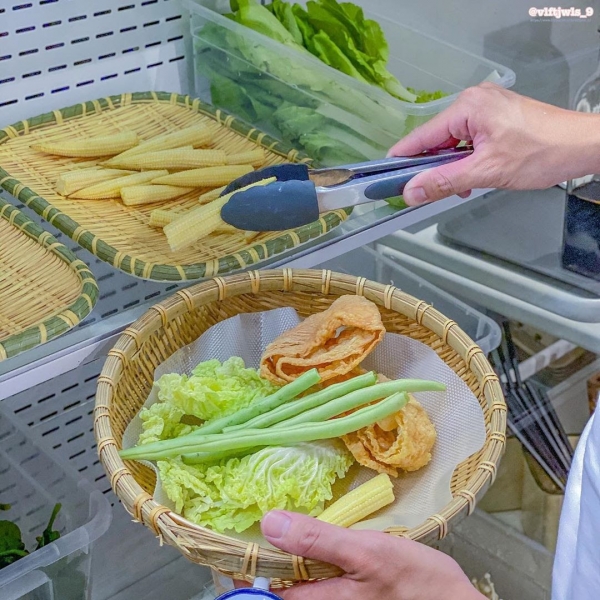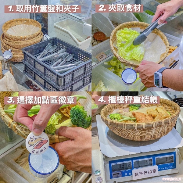 取用竹簍盤和夾子夾取新鮮的食材,加點區的部分有肉品!再至櫃台秤重結帳!