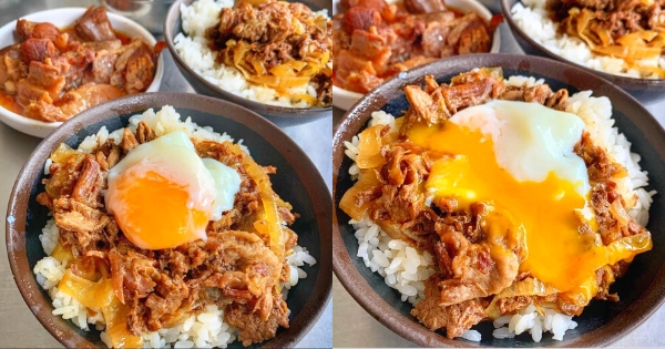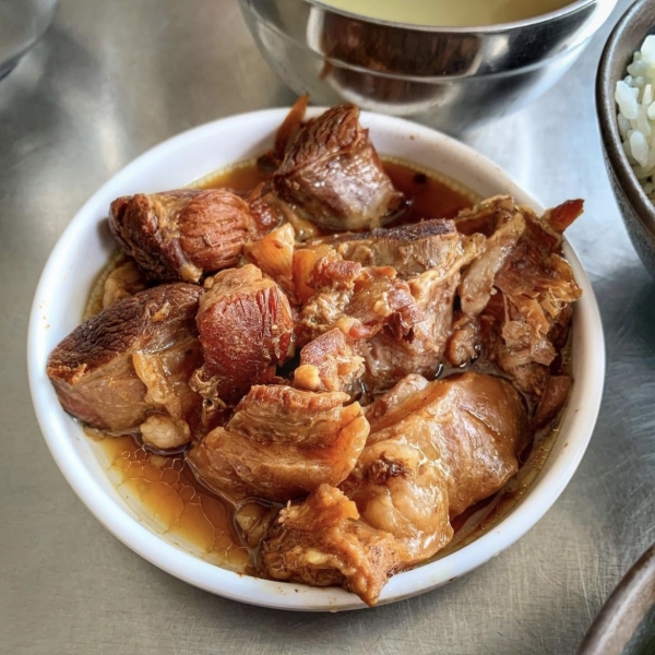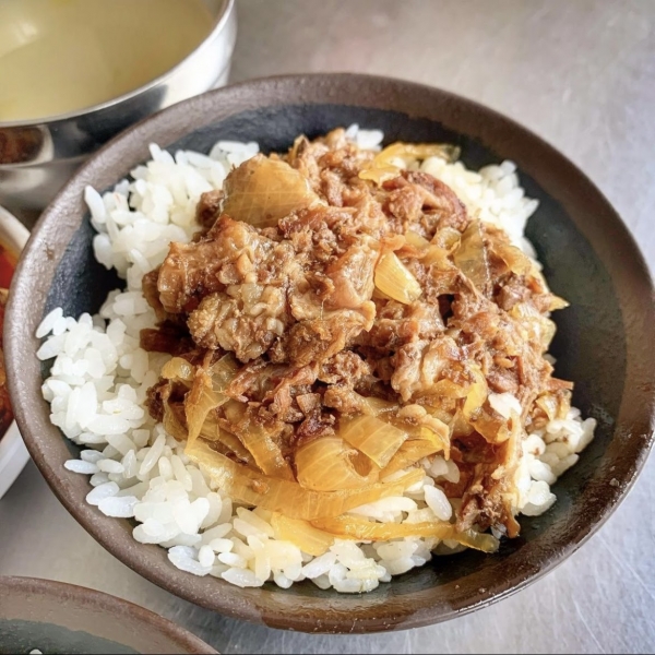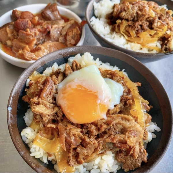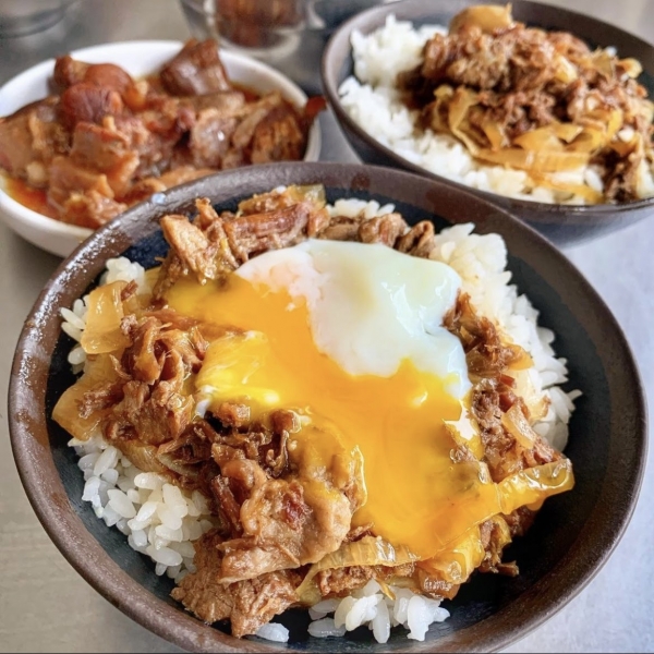 一進店門就會看到一大鍋滷牛肉不斷地飄香,淋上白飯就是一碗熱騰騰的牛肉飯,覺得肉量不夠還能再加肉量(需加價),軟嫩的牛肉與醬汁調味完美結合,鹹中帶有洋蔥的甜味,打上一顆溫泉蛋,半熟蛋液扒上白飯,根本絕配!