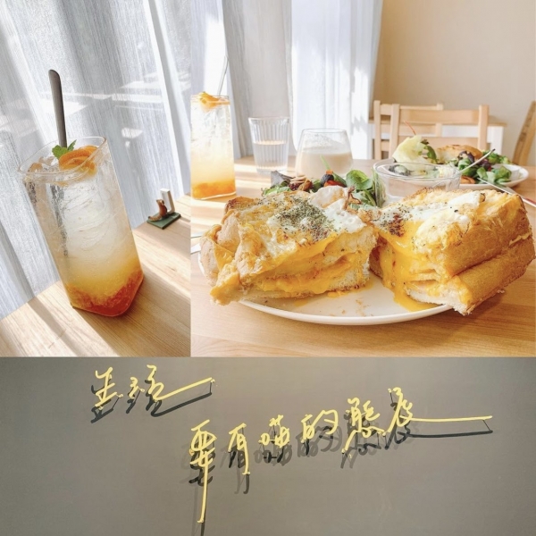 餐點有早午餐拼盤、特製三明治、法國吐司、沙拉跟鬆餅,飲品有茶飲、鮮奶茶飲、咖啡、氣泡飲等。每人低消1杯飲品,套餐部分都有附一杯60元飲料,也可以補差額更換飲品!