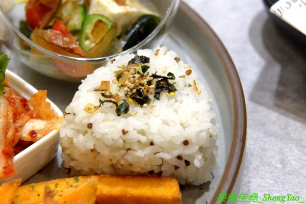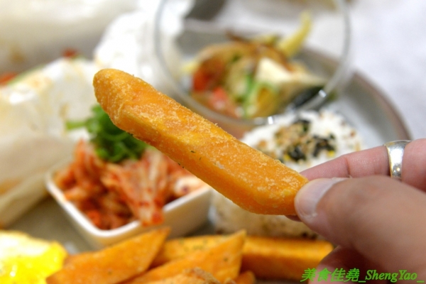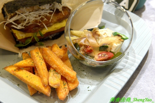 一樣有附香甜地瓜條和胡麻豆腐沙拉。