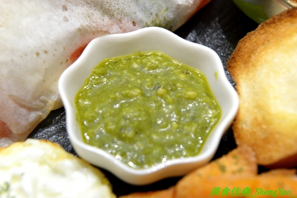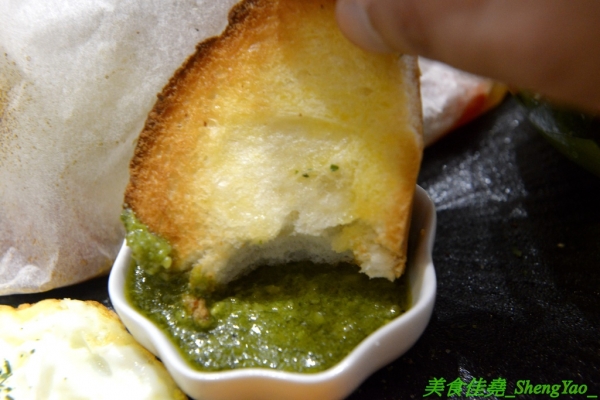 餐包還有附蘿勒醬可以沾,這個蘿勒醬挺特別的,