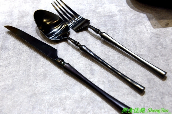 發現餐具只有刀子、叉子和湯匙三種,有點楞掉了,怎沒有筷子啊....哈。